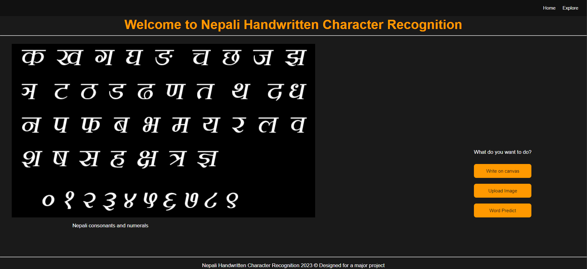 This project is a Nepali Handwritten Character Recognition system developed using Python, Flask, JavaScript, HTML, and CSS. It allows users to write characters on a digital canvas, upload handwritten images, or input concatenated words, with the system accurately predicting Devanagari characters.